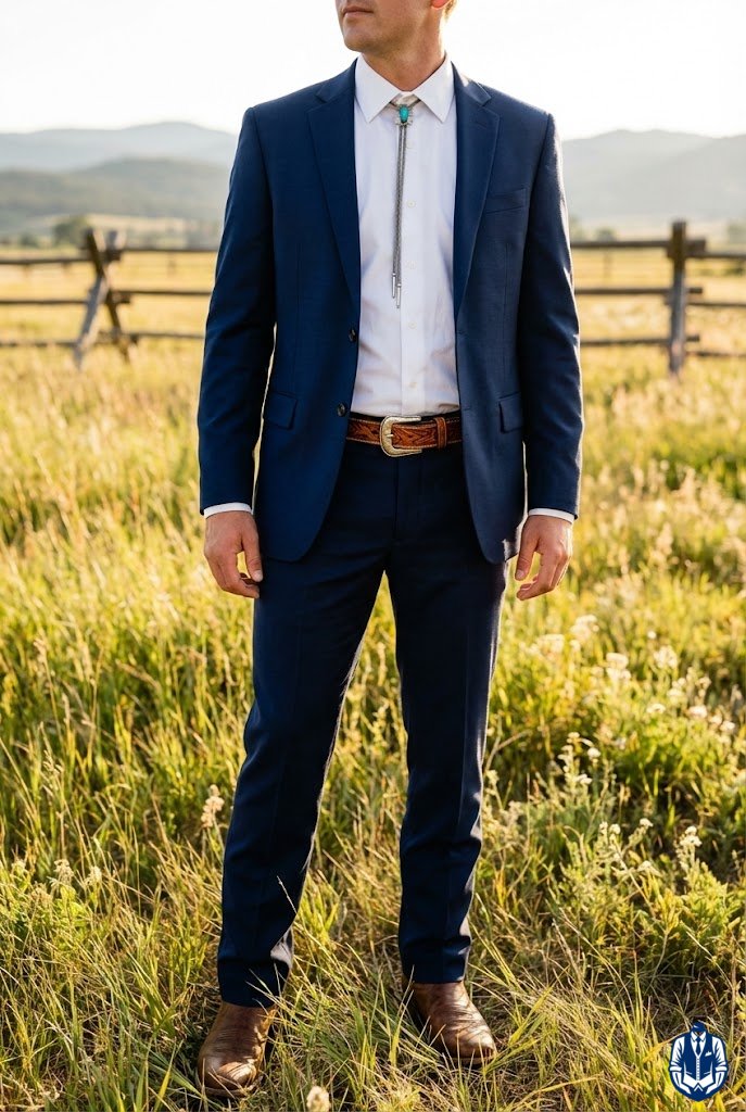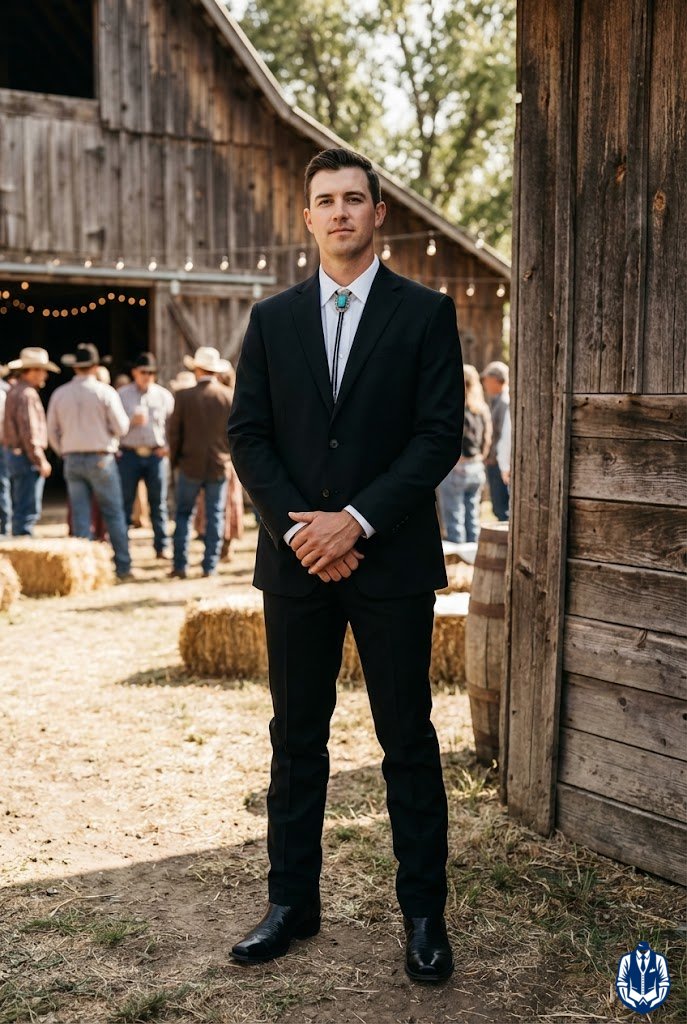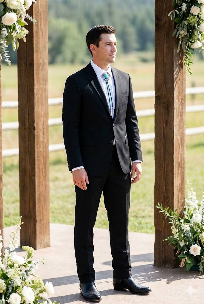 A classic cowboy groom look with a Southwestern twist. Replacing a traditional silk tie with a bolo tie instantly transforms a standard black suit into Western formal wear. It’s elegant, culturally rich, and very stylish.
