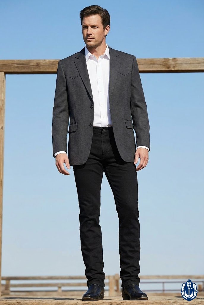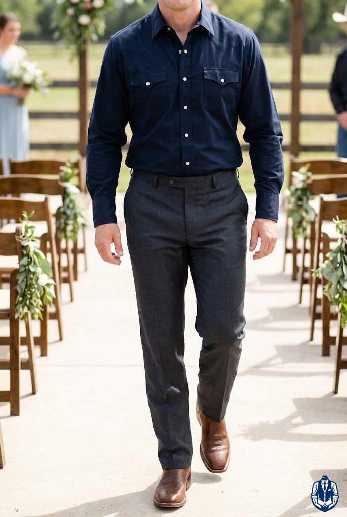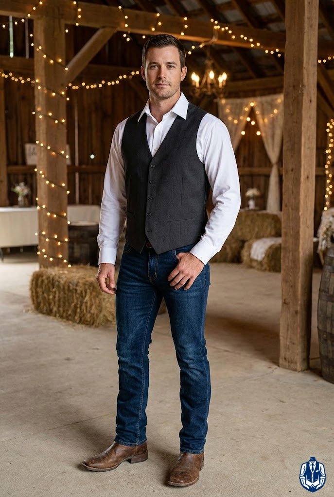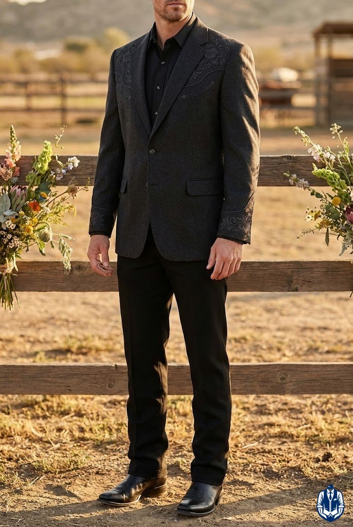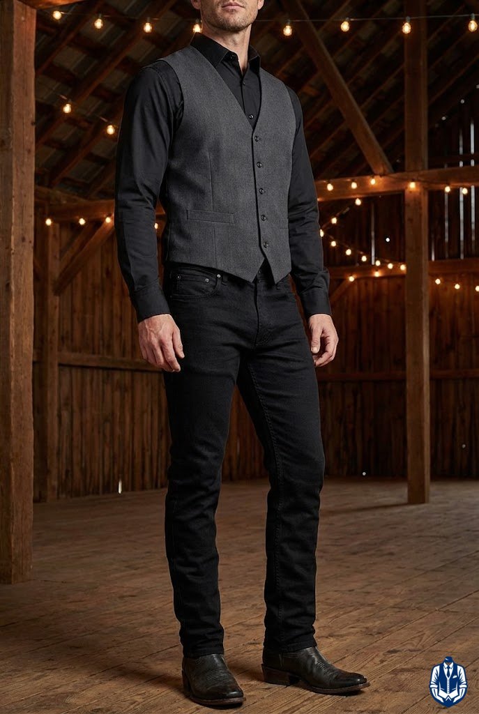 A masculine, medium-formal look for rustic venues. The black denim provides durability and comfort, while the Western blazer adds the necessary structure for a wedding. It’s the uniform of the modern rancher.