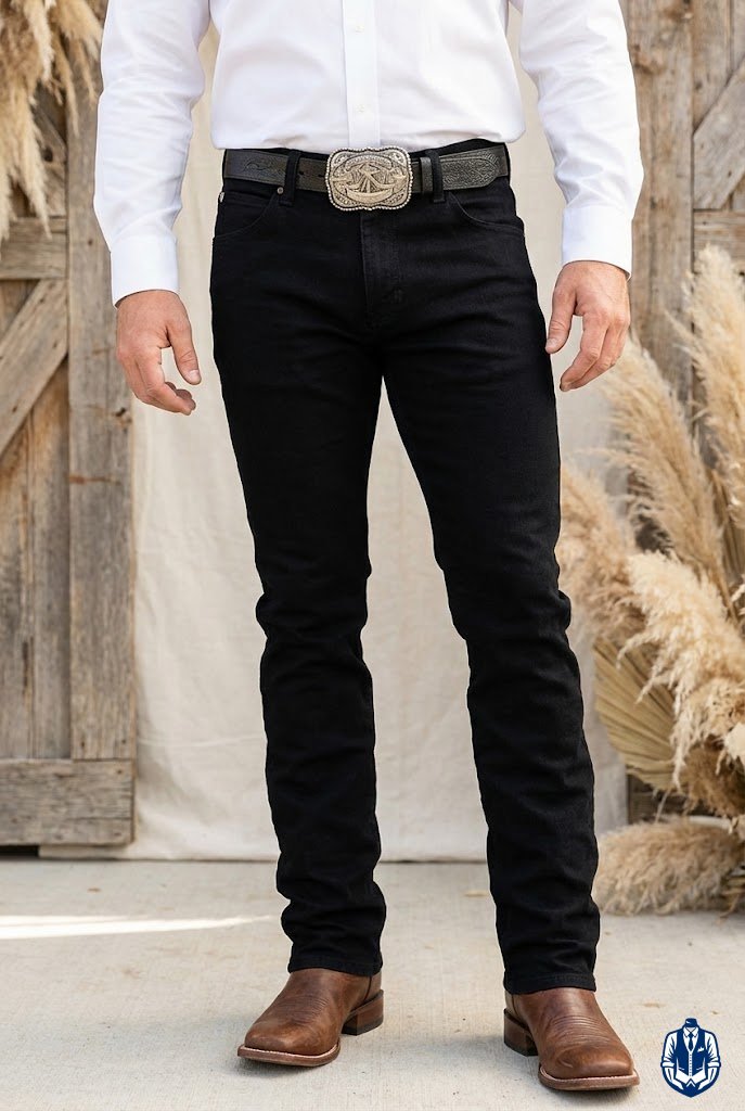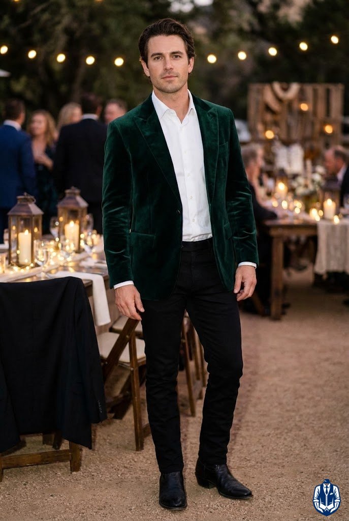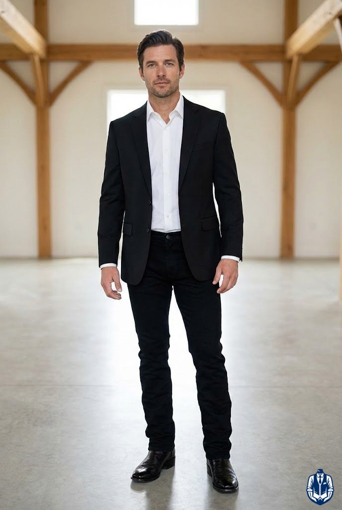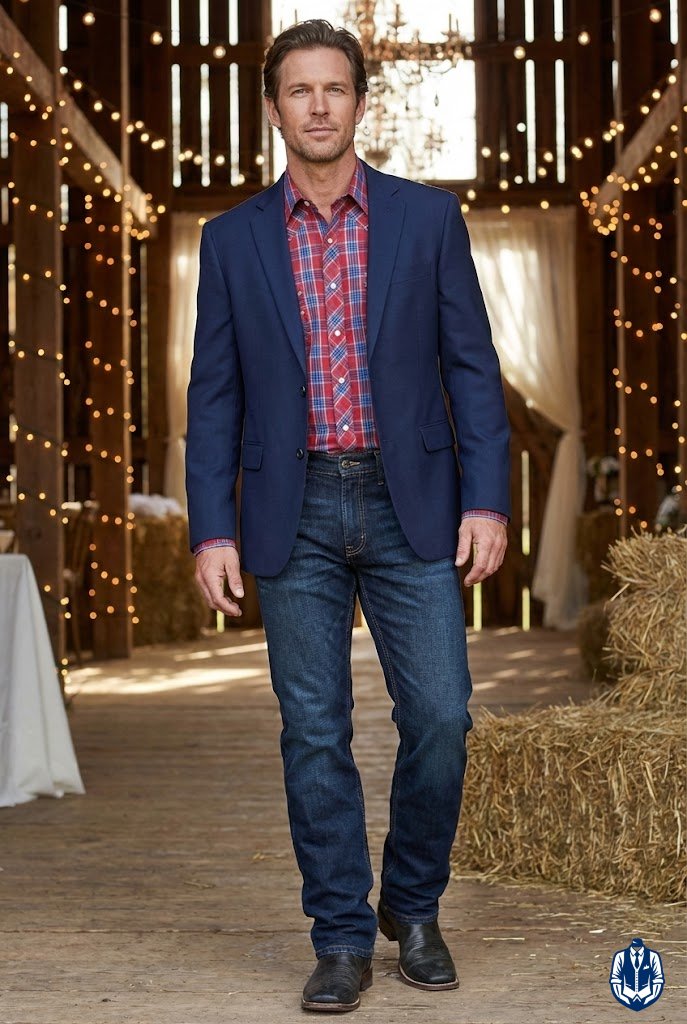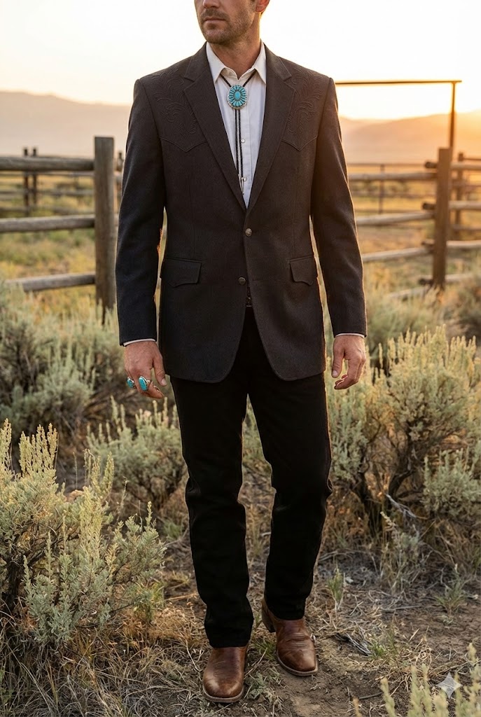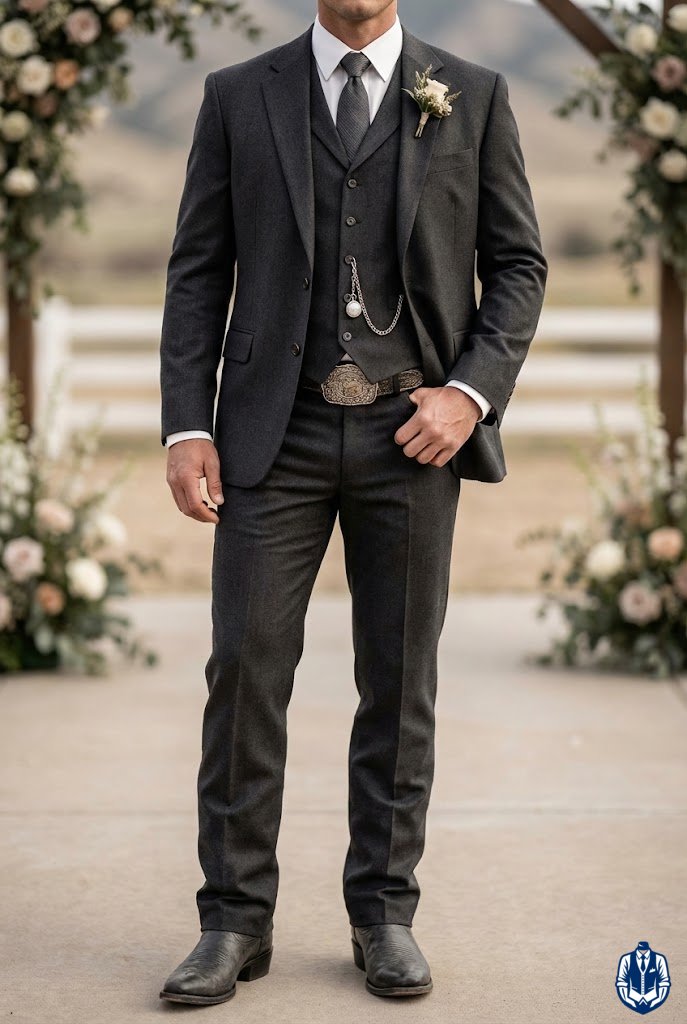 A masculine, medium-formal look for rustic venues. The black denim provides durability and comfort, while the Western blazer adds the necessary structure for a wedding. It’s the uniform of the modern rancher.