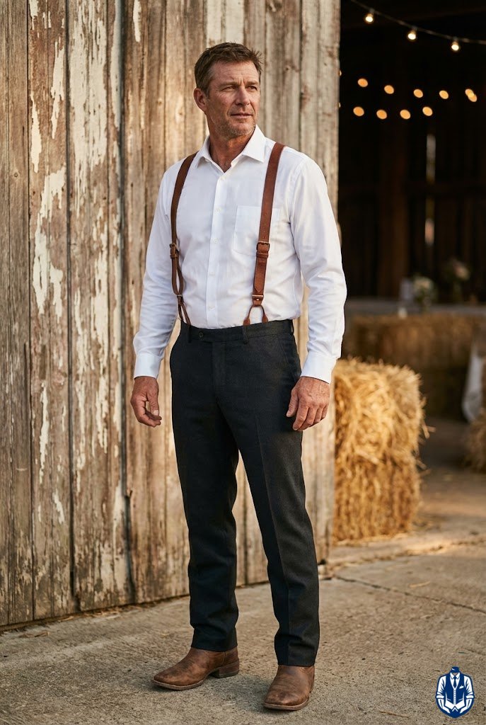 A simple, rustic groom or guest look that photographs beautifully against natural backdrops. Suspenders add vertical lines that slim the torso and add old-timey character without the bulk of a jacket. It’s perfect for hot summer weddings where a coat is too much.
