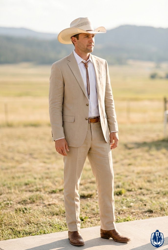 Perfect for warm-weather outdoor ranch weddings where breathability is key. Linen wrinkles gracefully and keeps you cool, while a woven straw cowboy hat offers sun protection and style. It’s the ultimate summer cowboy ensemble.