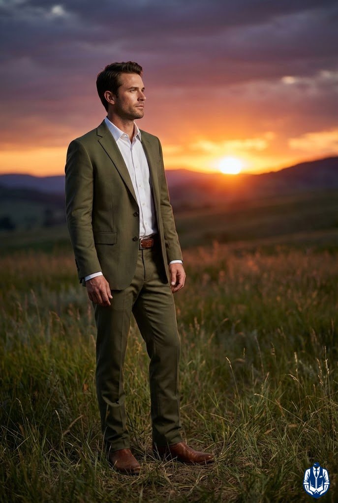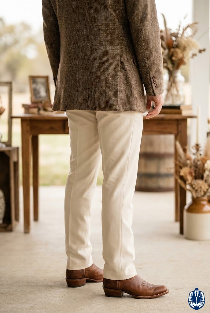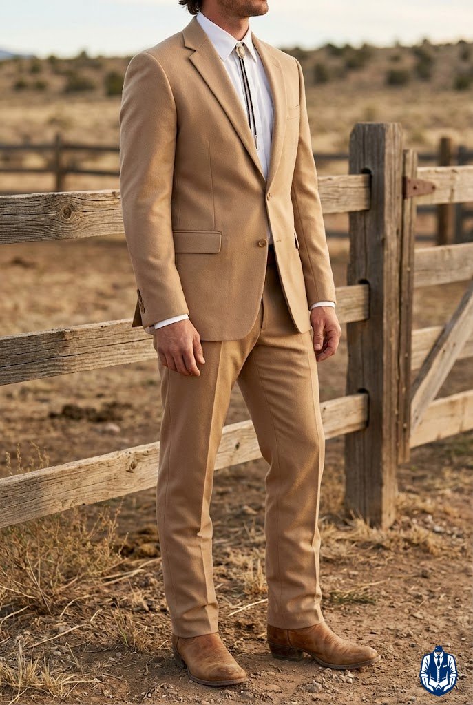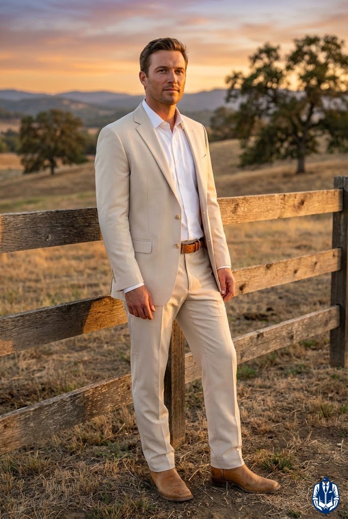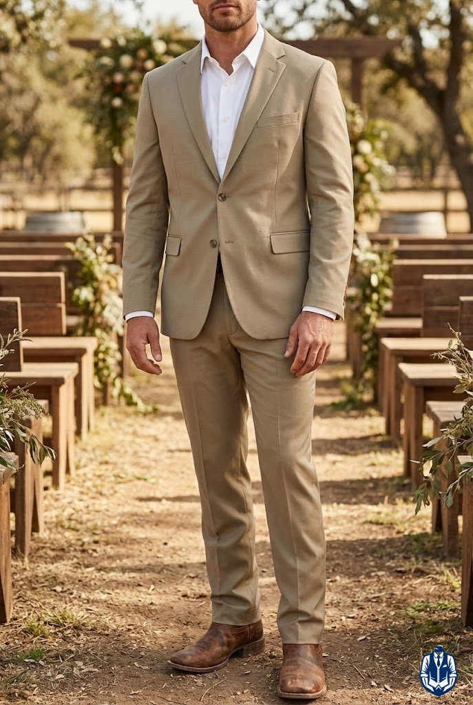 Earthy colors meet rugged texture for a modern cowboy feel. A khaki suit is a wedding staple, but pairing it with distressed, lived-in boots gives it immediate cowboy credibility. It shows you aren’t afraid of a little dirt.