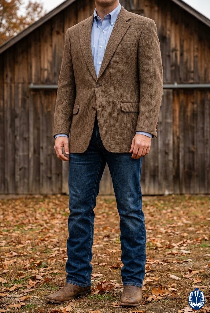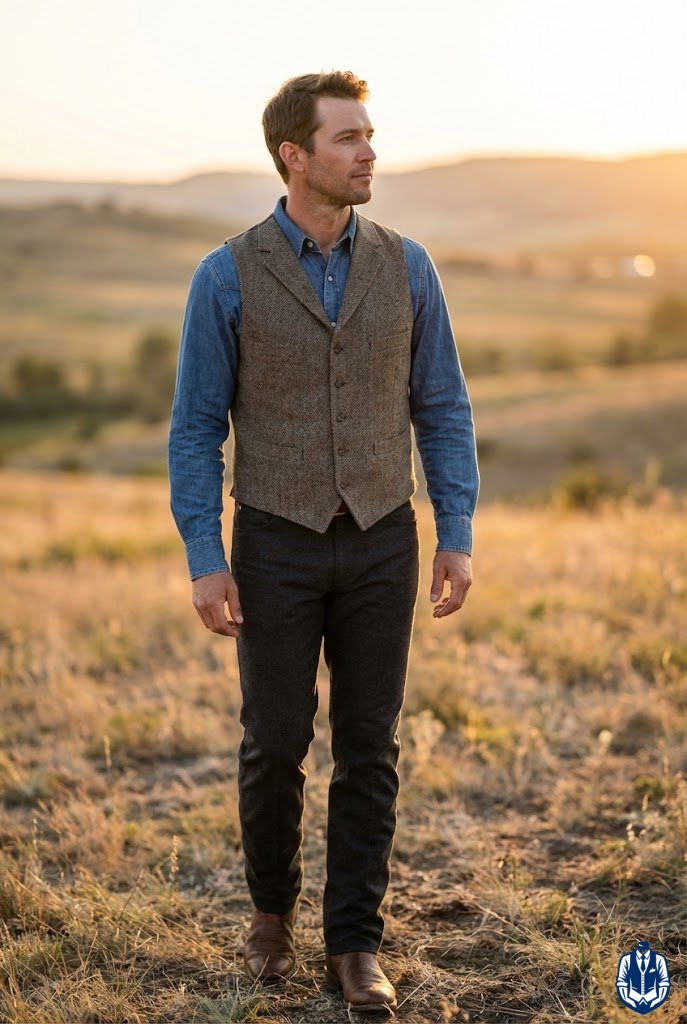 A cozy fall cowboy wedding look with texture and rugged charm. Tweed offers warmth and a heritage feel, while dark denim keeps the vibe grounded and Western. It’s an excellent choice for a mountain or barn wedding in cooler months.