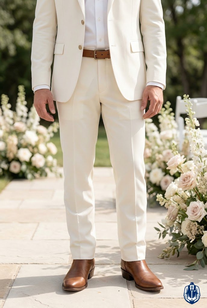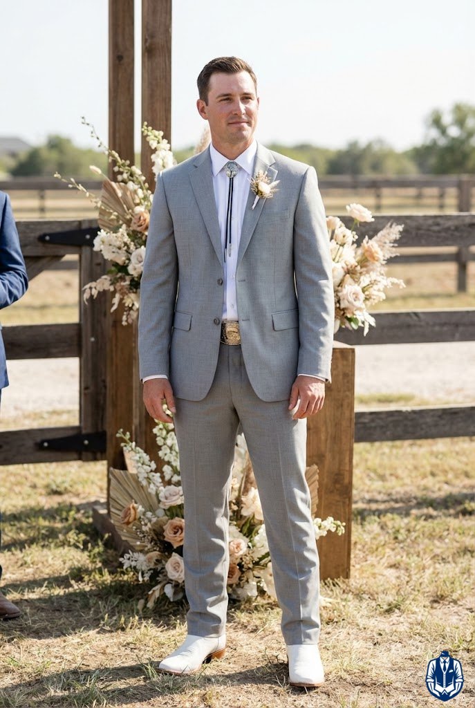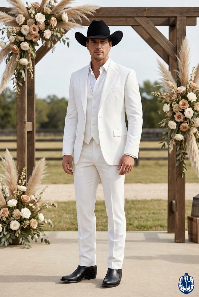 Soft neutrals combined with clean white boots give a refined Western aesthetic that feels fresh and airy. This combination is particularly striking for outdoor weddings in open fields or gardens. It’s a clean, crisp look that signals a special occasion.