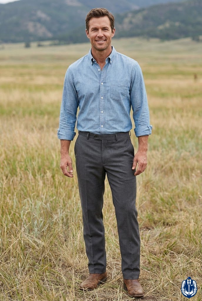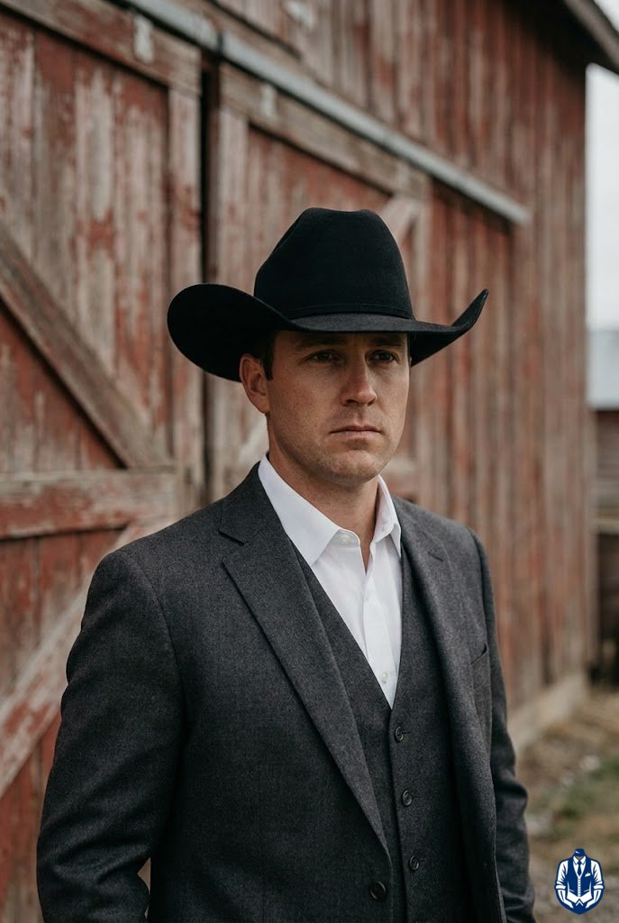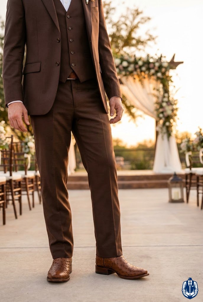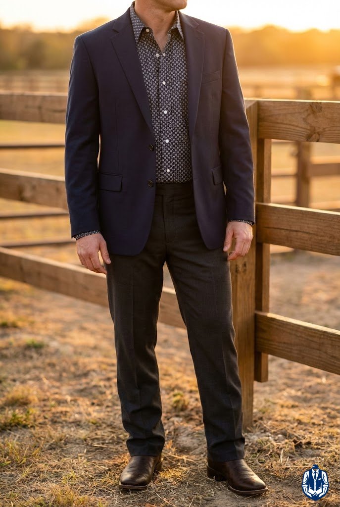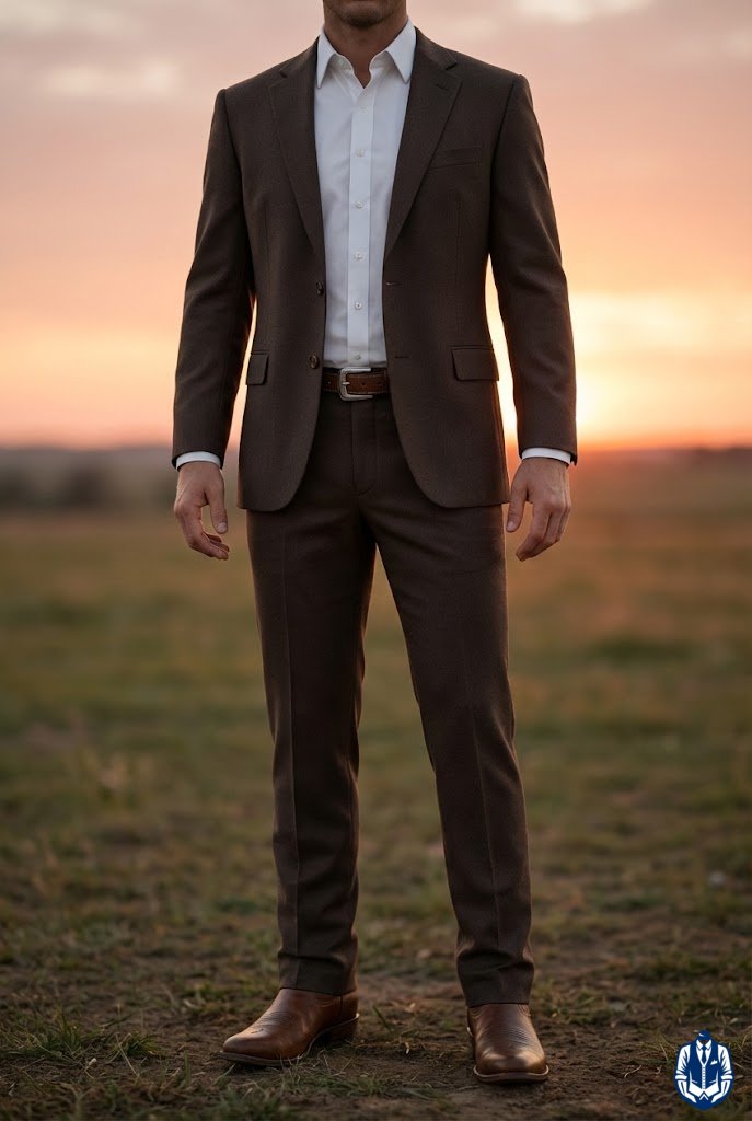 Mixing neutral suit tones with warm leather footwear creates a pleasing contrast. While old rules said “no brown with black,” modern cowboy style embraces brown boots with charcoal or black suits for a rugged edge. It breaks up the monochrome look.
