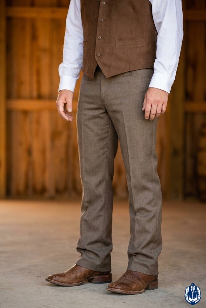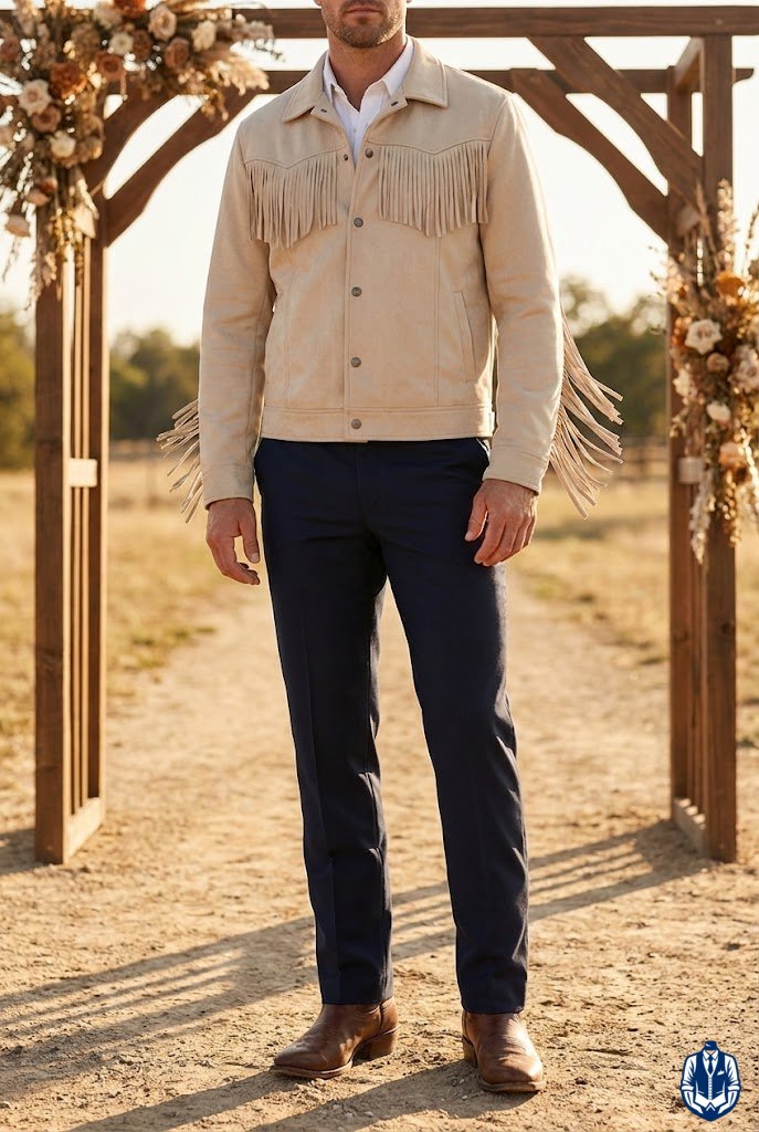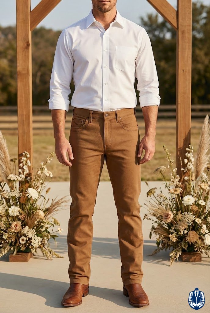 Subtle Western stitching gives the pants cowboy wedding flair. You don’t need actual chaps; look for trousers that feature reinforced stitching or fabric overlays that mimic the look of riding gear. It’s a subtle nod to the rodeo.