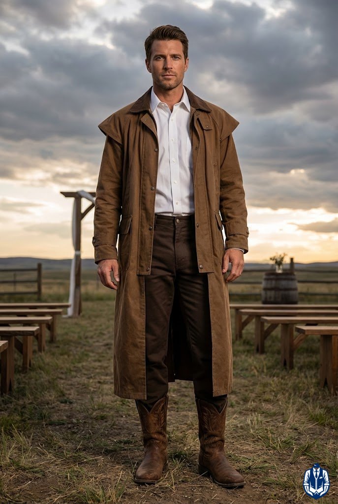 Great for outdoor ceremonies with dramatic photo potential. A duster coat adds a layer of mystery and rugged protection against the elements, making for incredible “walking into the sunset” photos. It’s practical for windy or dusty venues.