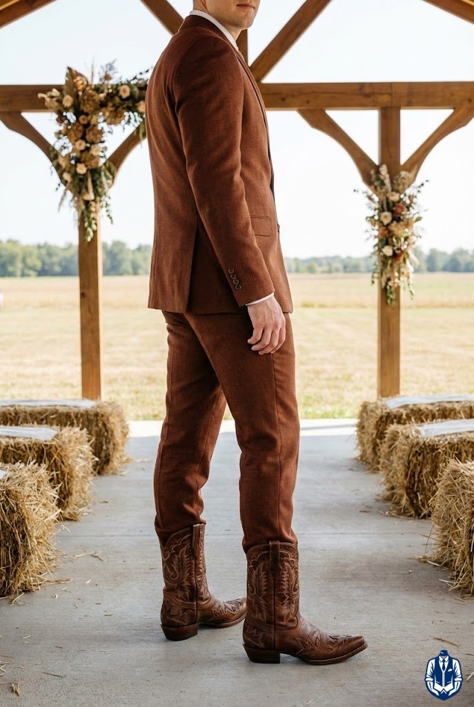 Earthy tones feel warm, authentic, and ideal for outdoor barn weddings where you want to complement the natural surroundings. A rust brown suit pairs beautifully with intricate stitching on your boots, adding texture to the ensemble. It’s a bold choice that feels grounded and masculine.