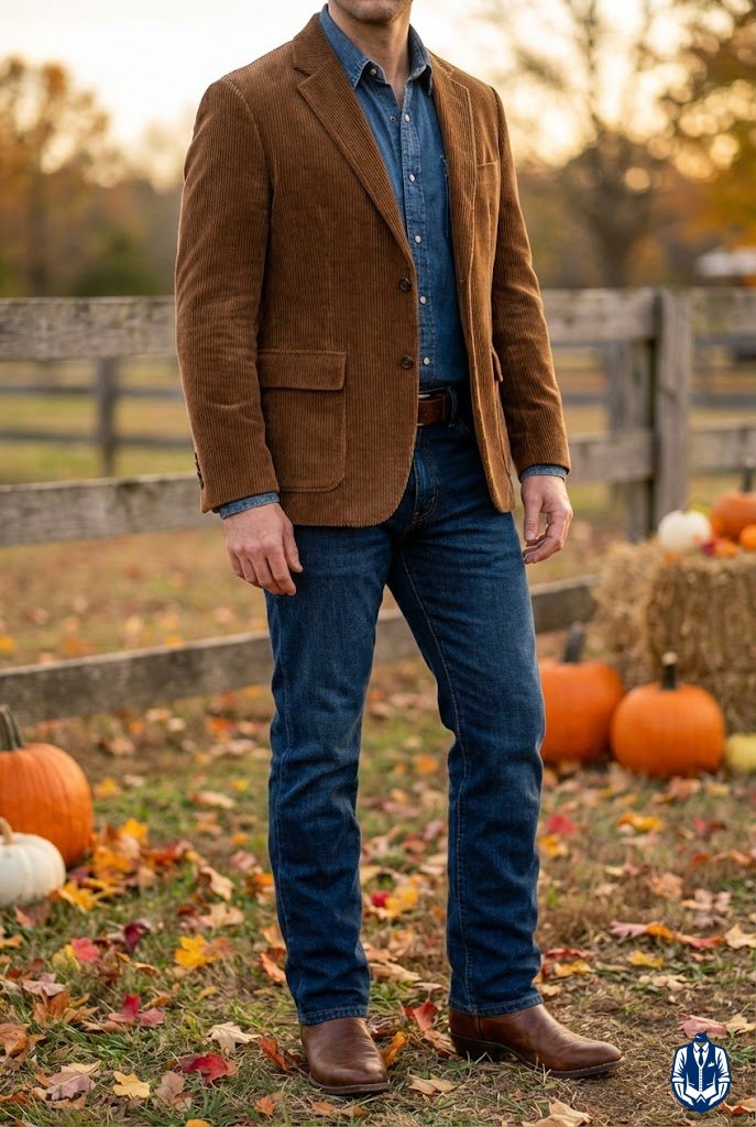 A cozy cowboy outfit for fall or winter weddings. Corduroy has a rich texture that feels warm and inviting, pairing perfectly with the ruggedness of denim. It’s a tactile look that guests will love.