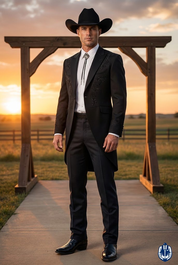 A formal cowboy groom look that stands out in photos. The tailcoat silhouette is traditional formal wear, but when done in a Western cut with a hat, it becomes iconic. It’s dramatic and perfect for a grand entrance.