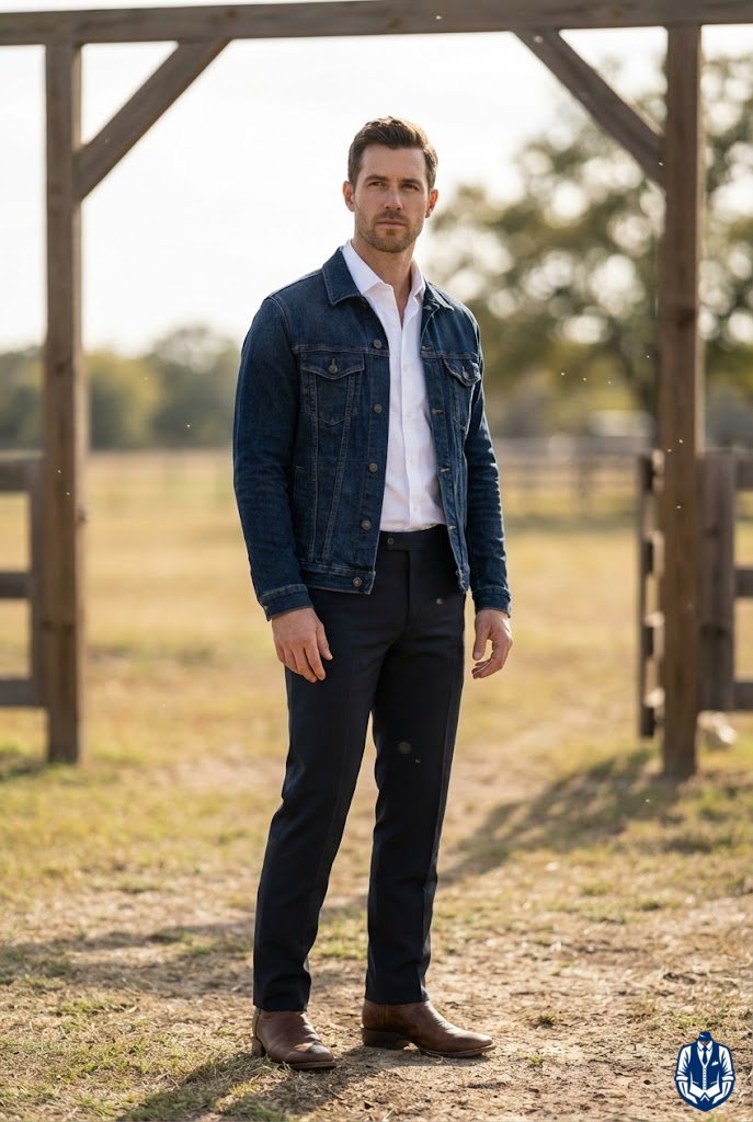 A casual-but-polished cowboy wedding look perfect for rustic venues or rehearsal dinners. By layering a high-quality denim jacket over a crisp dress shirt and slacks, you strike a balance between approachable and dressed up. It’s rugged charm at its finest.