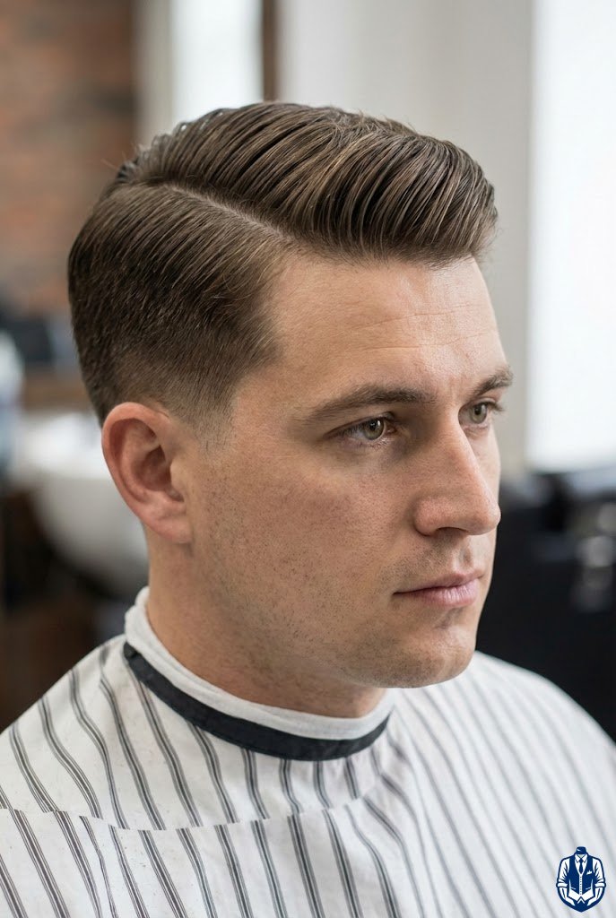 For a softer, more approachable look, try sweeping your hair to the side. It maintains clean edges while allowing for a bit of soft direction on the top in this gentleman haircut variant.