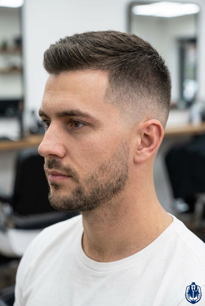 Why settle for a standard buzz when you can have a total style upgrade? This version adds a clean fade to the classic crew cut for a more polished appearance.