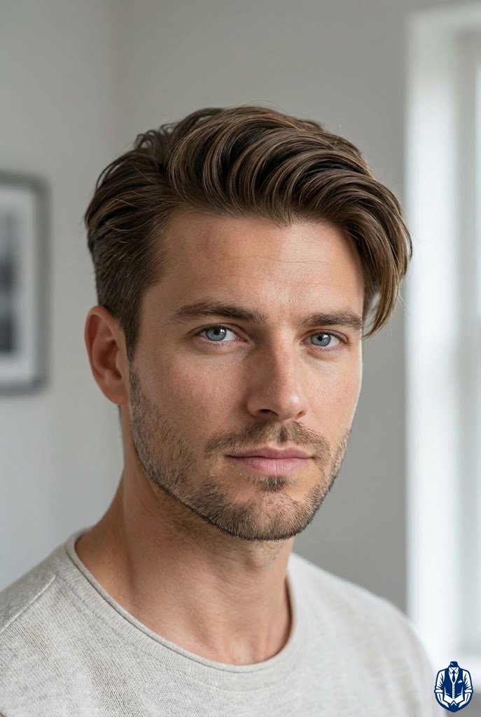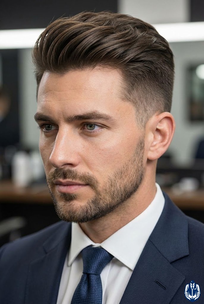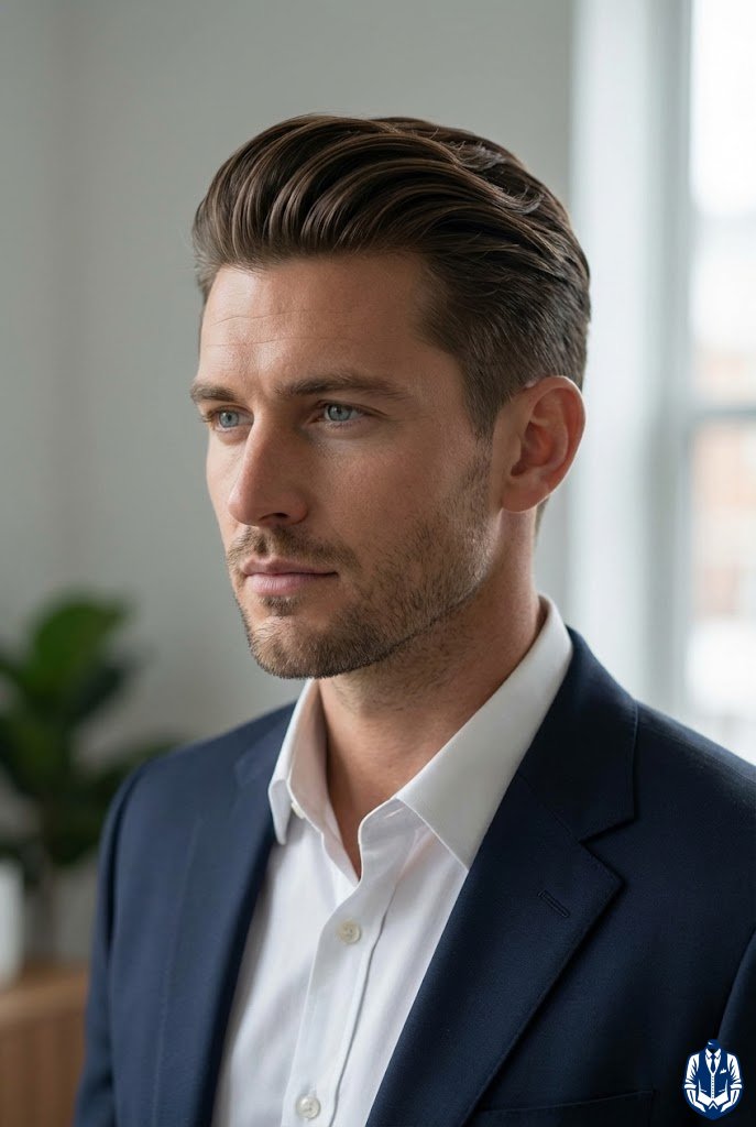 For the man who wants a gentleman haircut with a bit more life and natural movement. It’s the relaxed cousin of the formal slick back, making it perfect for a casual Friday.