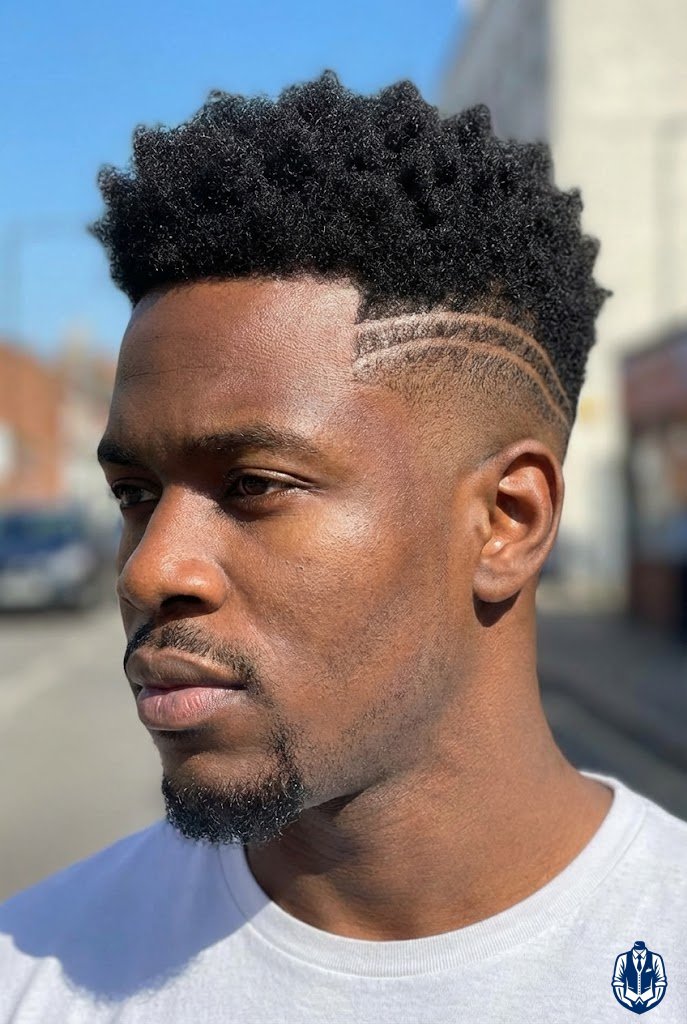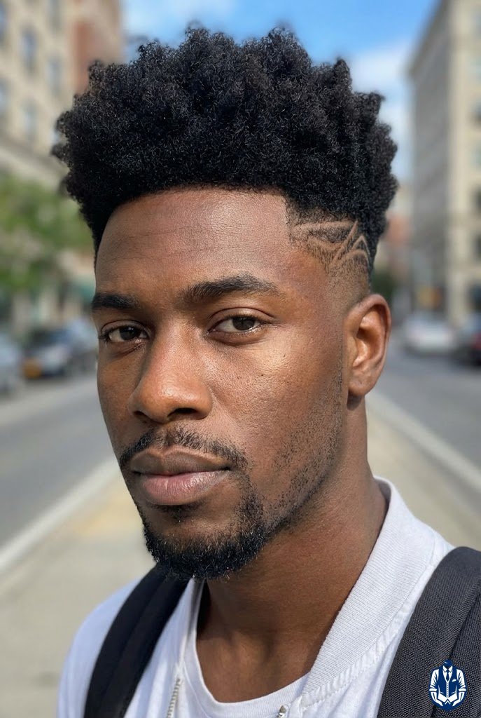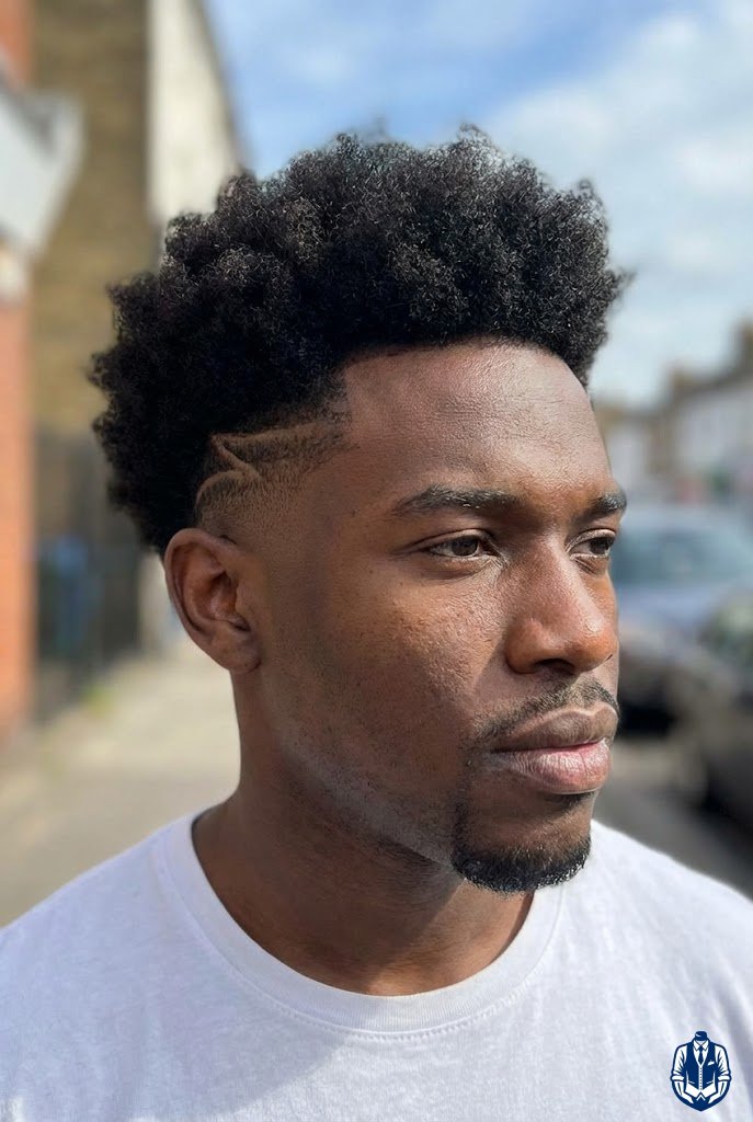 Pair a full afro top with faded sides that include artistic shaved designs. This style emphasizes creativity and personal expression through hair art.