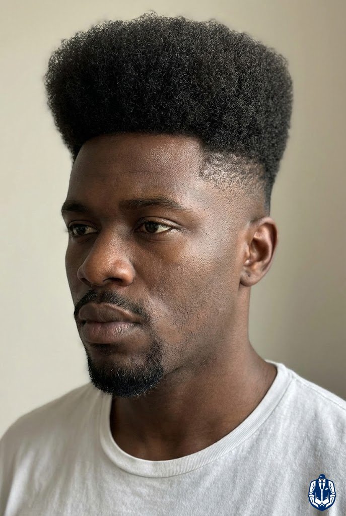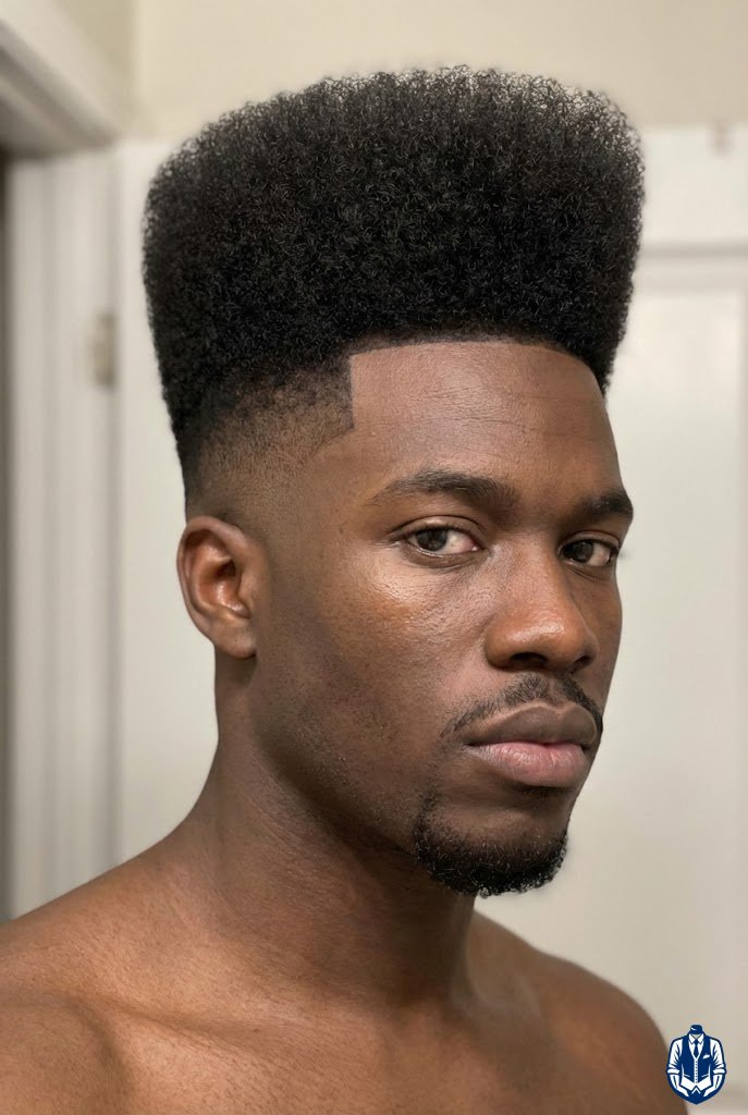 Features a tall, box-shaped afro on top paired with sharply faded sides for maximum contrast. This style emphasizes height and structure, making it a true statement haircut.
