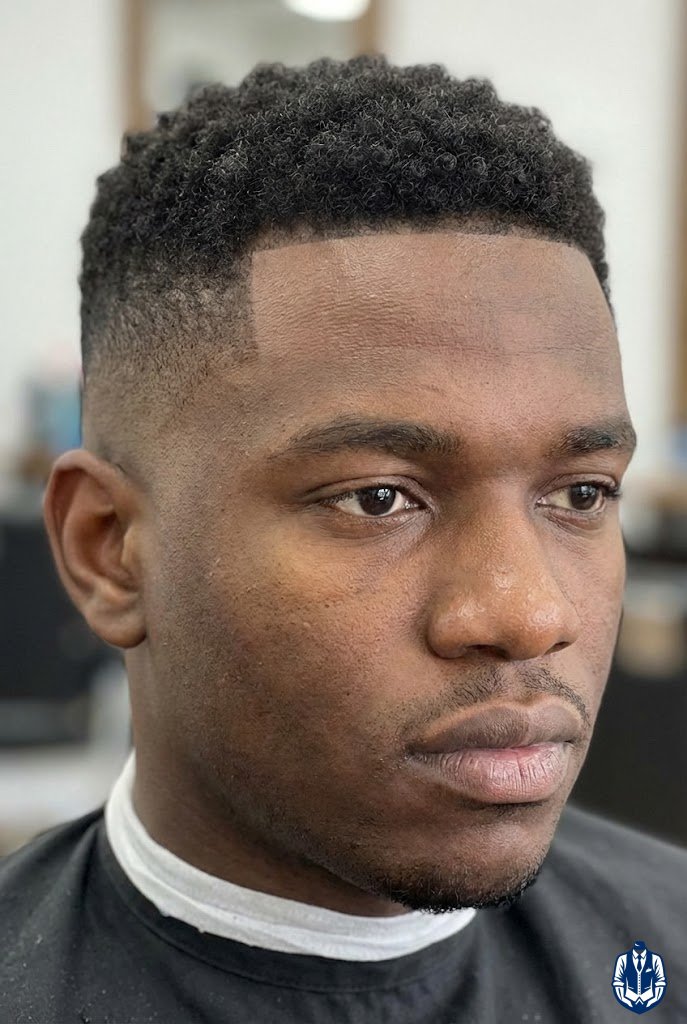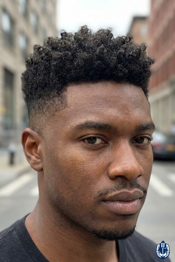 Rock very short afro curls on top with a skin fade on the sides and back. The result is sharp, minimal, and incredibly easy to maintain for busy mornings.