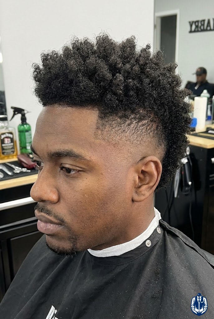 Shape your curly afro hair into a central mohawk with cleanly faded sides. This haircut emphasizes volume, movement, and a bold personality that stands out.